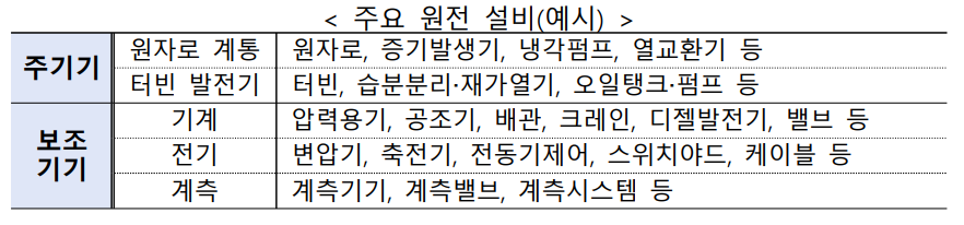 그전에 원전 설비란 원자력 발전소의 핵반응과 에너지 생산을 조절하고 지원하기 위한 시스템, 장비 및 구조물의 모음을 의미합니다. 산업자원부 보도자료에 아래와 같이 원전 설비의 분야에 대한 예시가 제공되었습니다.