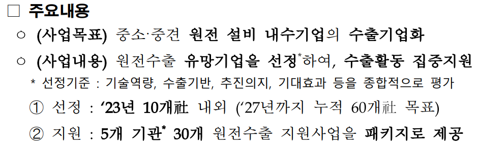 정부가 2027년까지 원전설비 수출을 위한 100개 기업 육성을 프로그램을 진행할 예정입니다. 이번 지원 프로그램은 2027년까지 기존에 수출 경험이 없는 기업 60개 사를 선정하여 각 기업 당 연 4억 원, 5년간 20억 원(금융 지원 제외)을 지원하고 , 선정된 기업에는 마케팅, 인증/등록, 금융, 기타 부문 총 30개의 지원 사업을 진행할 예정입니다.