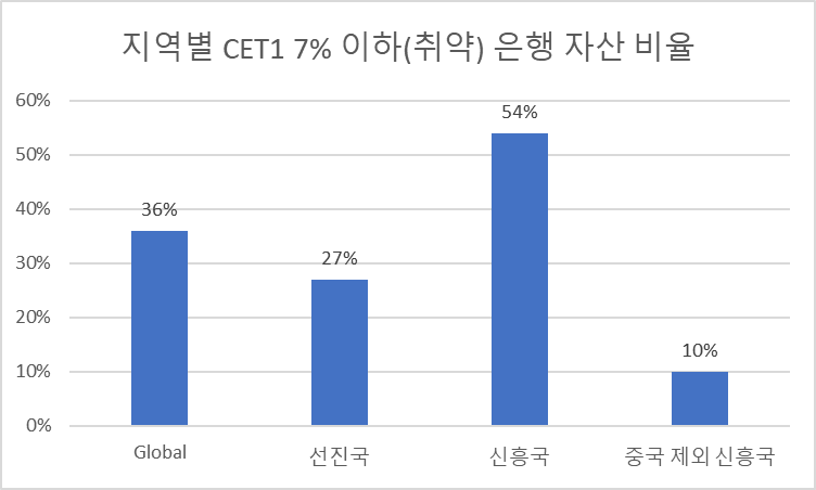 이러한 상황에서 IMF는 29개국에서 약 900개 은행에 대해 스트레스 테스트를 진행하였습니다. 그 결과 글로벌 은행 자산의 약 3%를 차지하는 30개 정도의 은행이 취약하지만 글로벌 은행 시스템은 일반적으로 아직 견고하다고 말할 수 있다고 합니다. 그러나 최근 급격히 논의되고 있는 스태그플레이션(인플레이션은 높고 성장이 낮은 경우)이 발생할 경우 상황은 급격히 달라진다고 합니다. 취약한 은행은 150개 이상으로 늘어날 것이며, 특히 선진국의 은행이 더욱 위험할 수 있다고 합니다. 구체적 수치로는 글로벌 은행 자산의 31%가 *CET1 규제 기준인 7% 밑으로 떨어진다고 합니다.