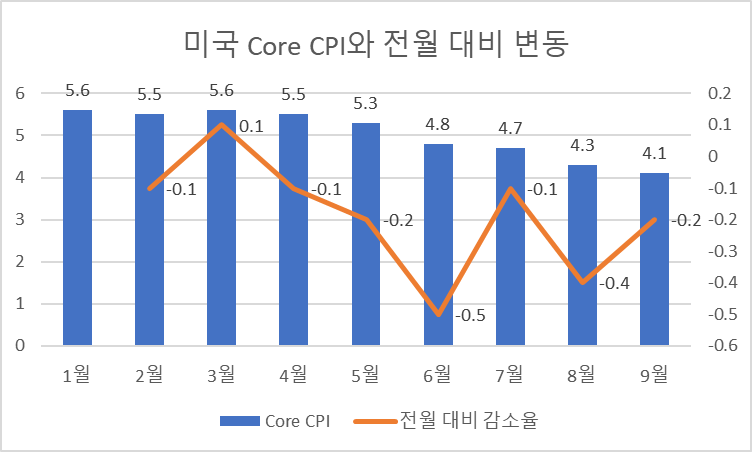 IMF는 먼저 선진국과 신흥국의 성장이 서로 다른 모습을 보인다고 이야기하고 있습니다. 선진국의 경우 Core CPI가 여전히 높고 감소의 속도가 느려 중앙은행이 기존에 예상했던 것보다 더 오래 지금과 같은 타이트한 재정 정책을 펼칠 수 있다고 보고 있습니다. 아래 그래프와 같이 미국의 전월 대비 Core CPI 감소가 9월에 -0.2%로 8월 기준 -0.4% 대비 낮아졌습니다.