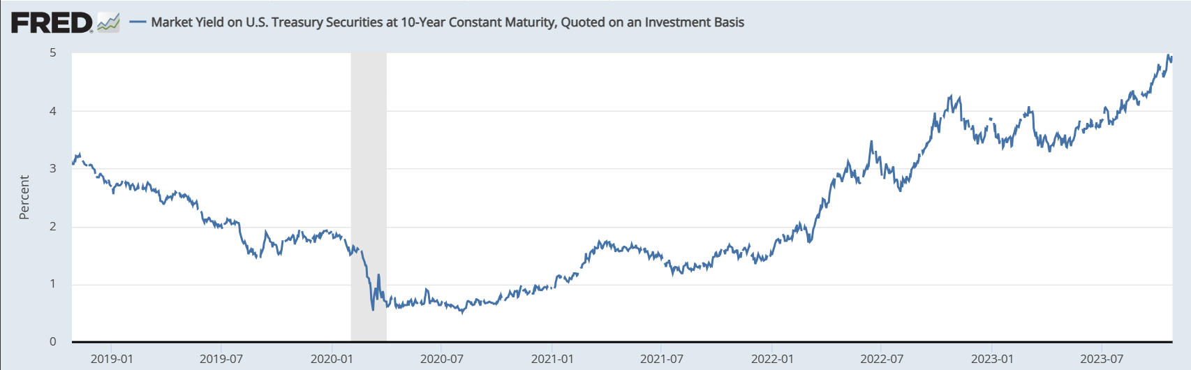 미국의 장기채(10년물 금리)가 최근 들어서 상당히 높아지고 있습니다. 23년 10/23일 기준 4.9740%로 5년 내 최고 수준입니다.